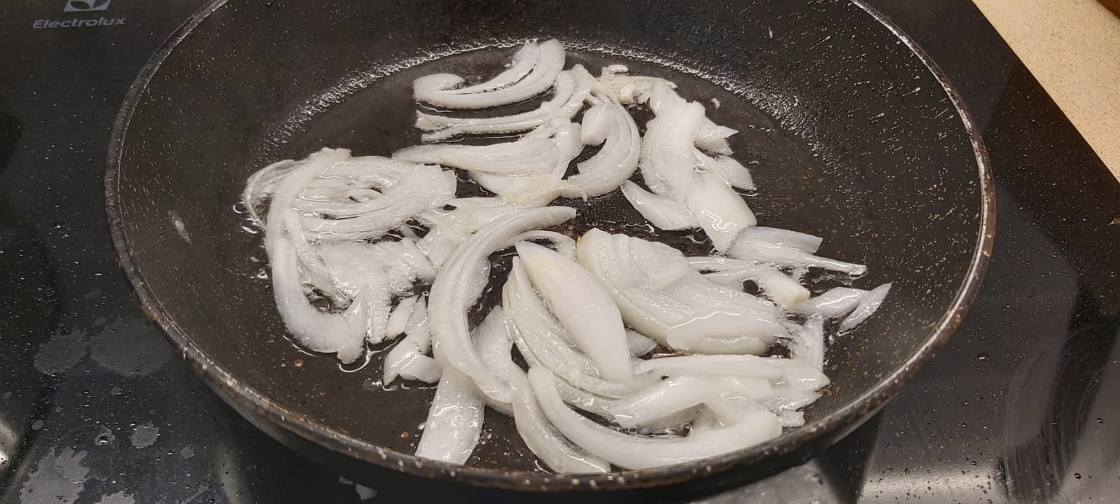 קוצצים בצל ומתחילים בטיגון הבצל במעט שמן, מקצצים שן שום ומוסיפים.